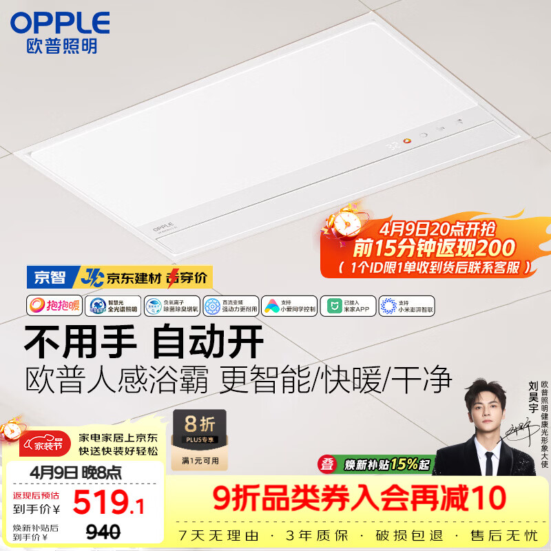 欧普照明(OPPLE)AI人感智能浴霸京系列抱抱暖变频恒温除菌 京智 【一价全包】