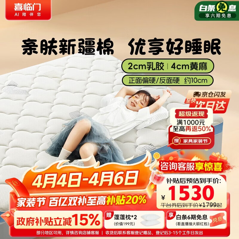 喜临门诺蓝10H升级版 0胶水薄垫2cm乳胶4cm黄麻床垫少年床垫1.5x2米偏硬